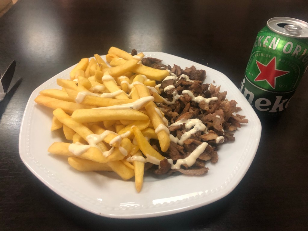 Crispy fries, doner meat, and sauce. There are many types of “loaded” fries on the late night menu.