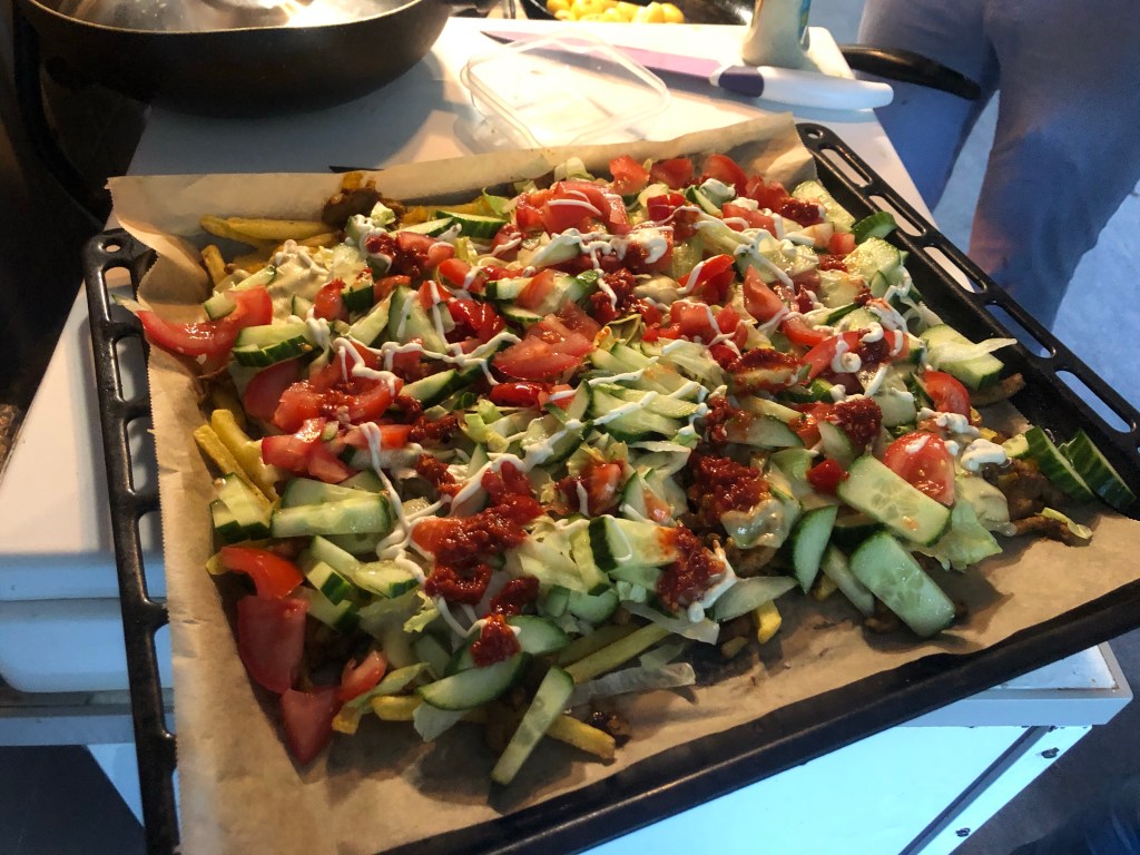 Chef Klaas likes to make his kapsalon with plenty of extra veggies. We all ate it and chatted in the living room.