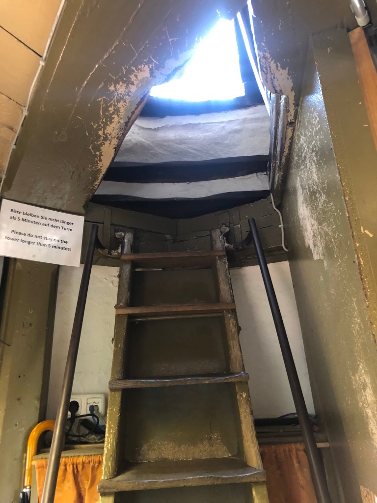 Okay, now this is where my footwear became a serious issue. As I neared the top of the tower, the stairs narrowed. To get onto the viewing platform, you must be somewhat acrobatic — you climb up a narrow stepladder and then, with the help of some handles, hoist yourself up out of the opening in the floor of the platform.