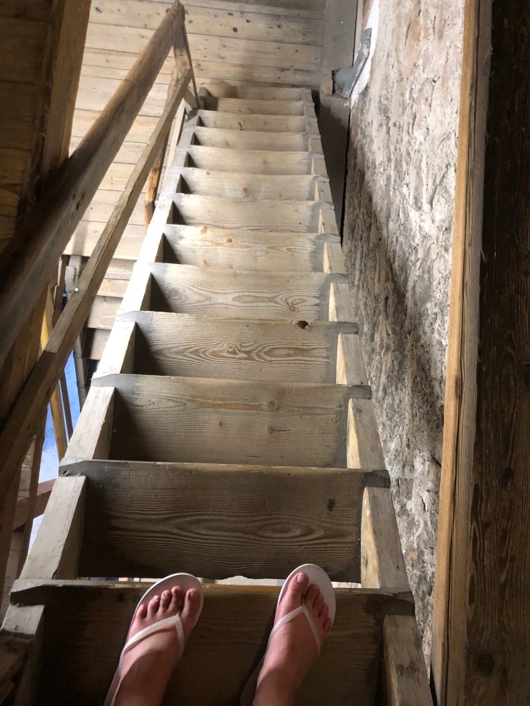 But the fear had also made my feet sweaty. And oh my god. My flip-flops were now SLIPPERY. Like, they were sliding off my feet with each step. So I now had to kneel down, descend through the opening backwards and climb down the narrow stepladder. It was terrifying. I made sure I had a good handhold at all times.