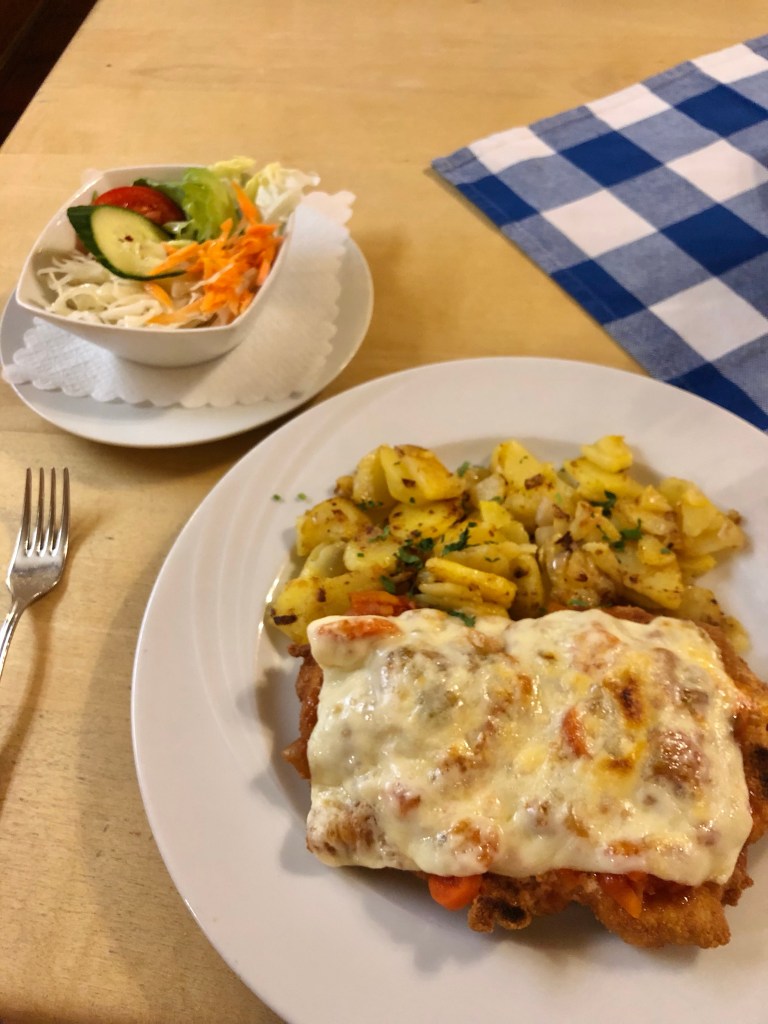 Schnitzel is a favorite treat. 🙂 Served up by a hoot of a waitress in a Dirndl who gave me a shot of liquor for free.