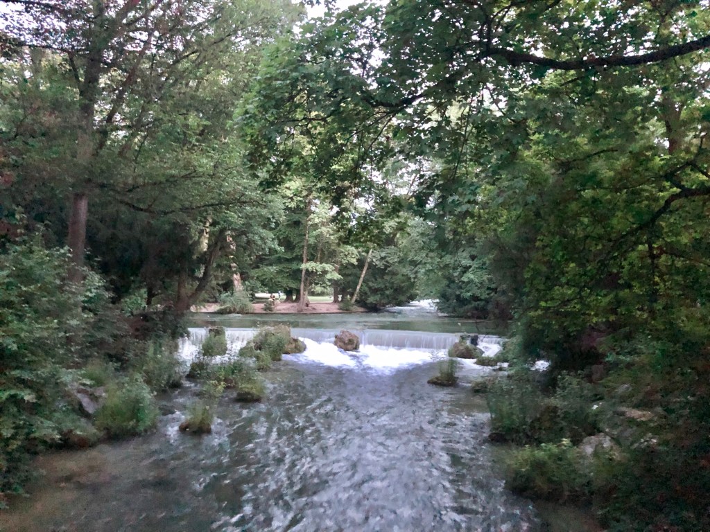 As for walking here in Munich, my favorite place so far has been the English Garden. Don’t be fooled by the quaint name; it’s actually a massive green space, even bigger than Central Park, right in the middle of the city. It’s famous for having a river in it where locals go surfing.