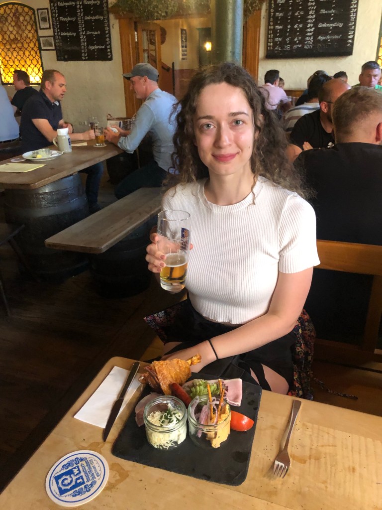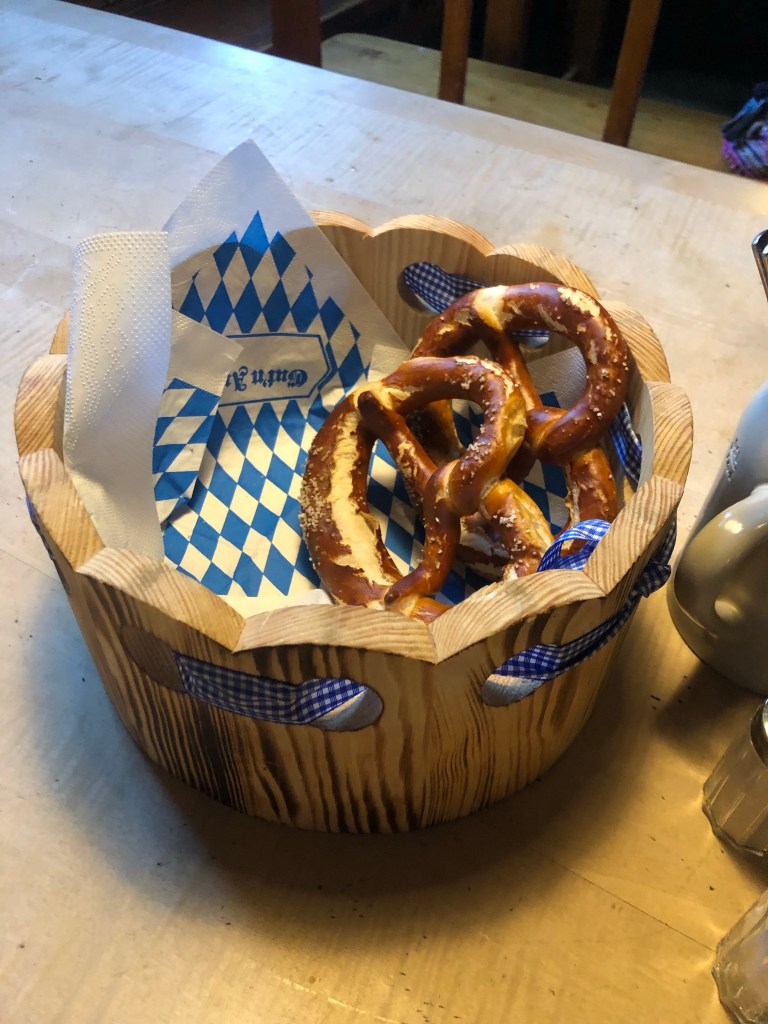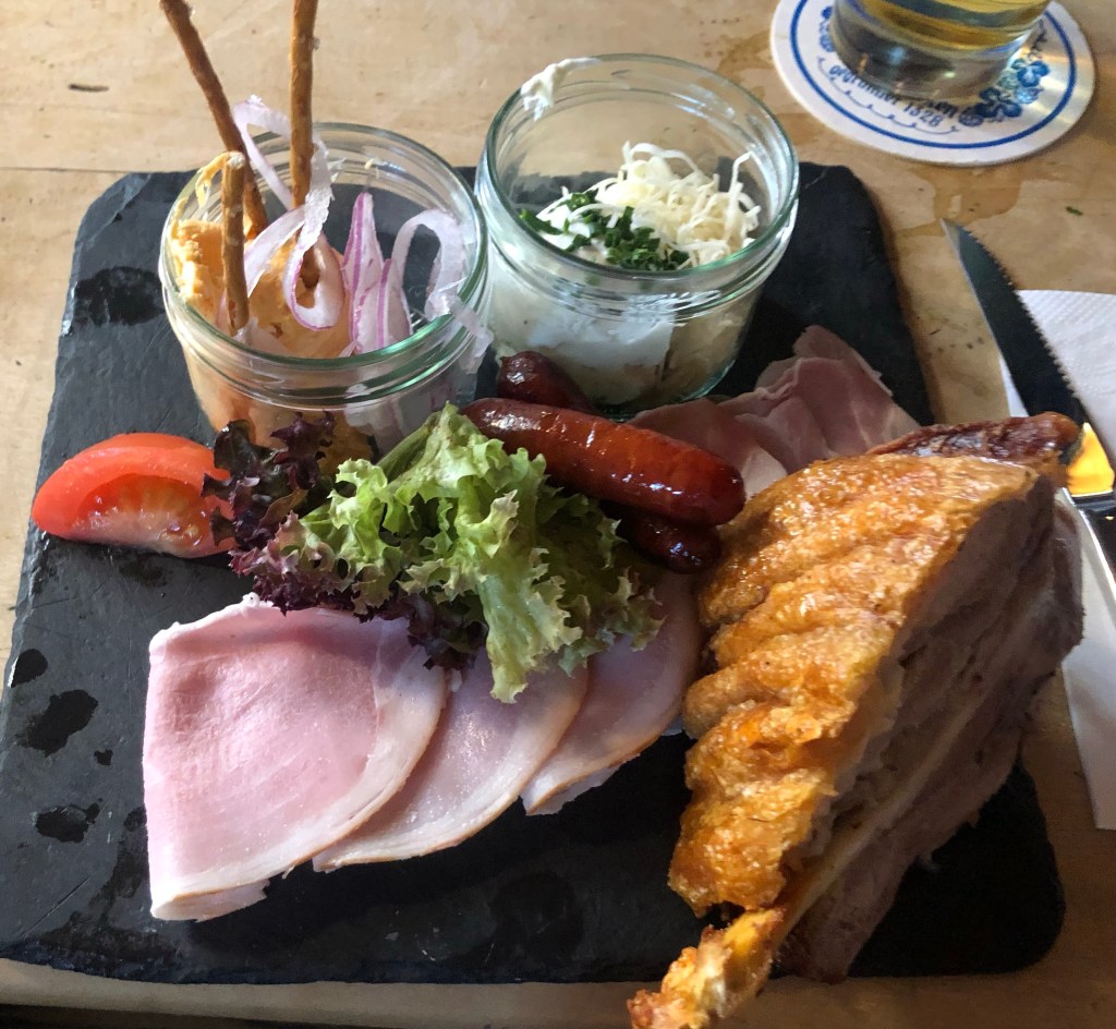 Bavarian “sample platter.” Obatzder cheese spread, horseradish sauce, Black forest ham, teeny weenies, and a hock of ham. Shortly after serving me this, the waiter asked me out for drinks after learning I was a solo traveler. Mein Gott!!
