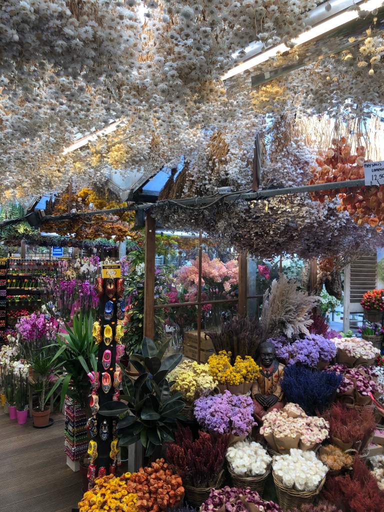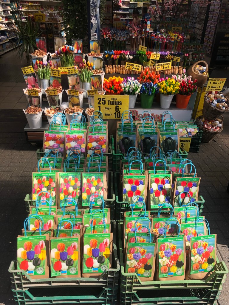 I started my day with a latte macchiato and waffle with banana slices. Then I went to maybe the most unique place to shop, the Flohenmarkt, a bunch of floating stalls on the canal. They mostly sold touristy goods like flowers, knickknacks and all kinds of tulips — bulbs, seeds, bouquets, and painted wood imitations. Besides tourist stuff, they also sold a lot of flowers. I really appreciate how cut flowers are for sale everywhere in the Netherlands, and appear to be a part of the culture.